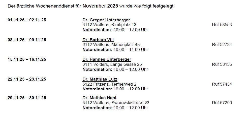 Untenstehend finden Sie den ärztlichen Wochenenddienst für November 2025: