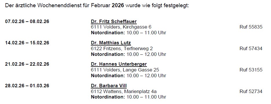 Untenstehend finden Sie den ärztlichen Wochenenddienst für Februar 2026: