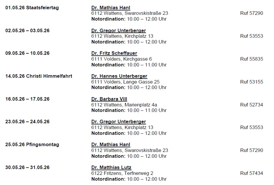 Untenstehend finden Sie den ärztlichen Wochenenddienst für Mai 2026: